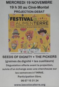 Actualités novembre 2025 : Ce mercredi 19, on se retrouve au cinéma de Montauban à 19 h30 pour une projection-débat dans le cadre du festival Alimenterre. Au programme, deux films courts : SEEDS OF DIGNITY (graines de dignité) et THE PICKERS (les cueilleurs). Invitée : Solène LEMICHEZ, doctorante à l’INRAE sur les semences et la biodiversité cultivée. Une soirée nourrissante !